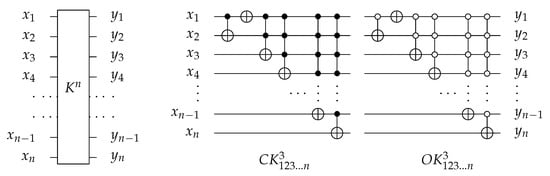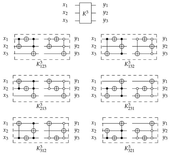 For 3-bit circuits, the library is universal for 40,320 possible circuits and has twelve generators , , , , , and with open and closed controls. gate is the merging of C, N, and gates into one gate () with for each generator. The library generators are shown in Figure 20 and the function of each generator is shown in Equation (6). To implement any generator in the reversed direction, the gates must be implemented in a reverse order by applying first, then N gate, and finally C gate.