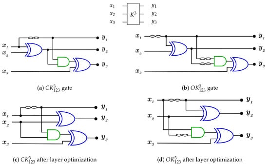 For 3-bit gate library, is constructed by a combination of N, , and gates. for each generator is equal to 5 as it is the sum of for N, C, gates. and are constructed as in Figure 24a,b with but some layers can be merged to work in parallel to reduce the generator cost down to 3 as shown in Figure 24c,d for and , respectively, with . For more details Table 2 presents the three layers in action for and in forward and backward directions.