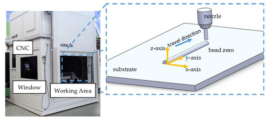 The torch, with an inclination angle of 90° concerning the substrate, used a 20 mm diameter nozzle to manufacture the bead. A mixture of 80% Ar and 20% CO2 was used as shielding gas at a flow rate of 18 L/min. A 17 mm stick-out was used. Figure 1 shows the arrangement of the components in the additive manufacturing; the axes on which the symmetry of the zero bead is analyzed are described.