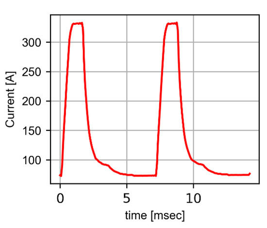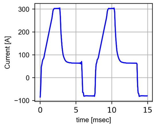 The shape of the current in pulsed GMAW transfer mode for two complete waves.