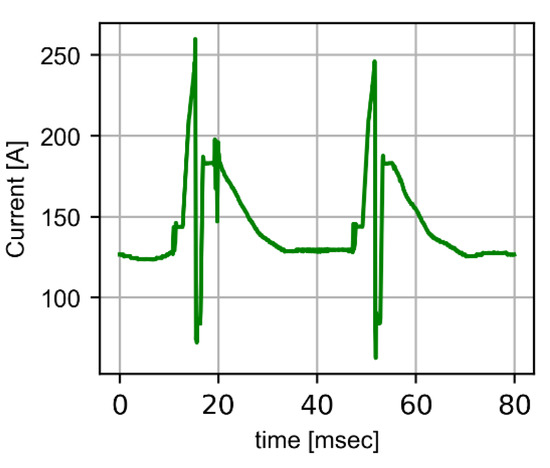 The principle of metal deposition in cold arc is based on causing a controlled short-circuit to deposit the drop. It is based on carrying out a short-circuit and re-ignition of the arc in a controlled process with a short reaction time. During the material melting process, the electrode (wire) is brought closer, keeping the current and voltage theoretically constant. It is observed that the material deposition does not occur at a constant frequency, being a somewhat more erratic deposition than in the case of the metal projection of the processes (pulsed AC and pulsed GMAW) in which the deposition is at a more constant frequency. In Figure 3, two complete waves are observed in which the different phases of controlled current are observed.