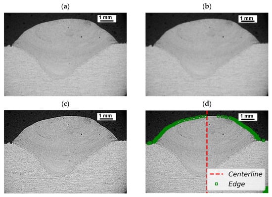 The first treatment on the images obtained from the microscope was carried out to determine the center line in which to compare the symmetry of the bead both in its transverse and longitudinal section. The walls and zero-layer weld beads were first cross-sectioned in the middle portion and mechanically polished with Barker’s electrolytic, and etching was performed to reveal the grain, applying 14 V for 120 s. After preparation, each sample was observed with an optical microscope (Eclipse MA200 Nikon). The inverse blur filter on a low-noise image was applied in order to shape the image. Figure 5 shows the sequence followed for image processing, similar to that shown by [36].