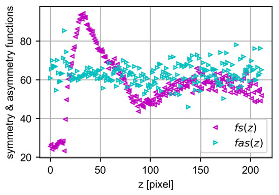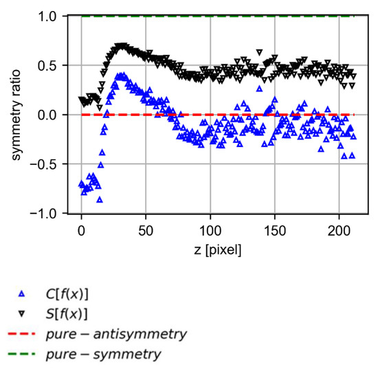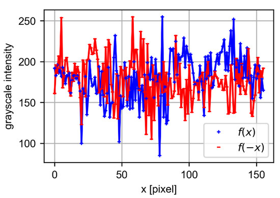 For the analysis of the symmetry in the bead image in layer 0, an approach similar to that used by Zielke et al. [37] was applied to the non-industrial images. The function was taken, where y is the intensity of the pixel in the gray color scale. The x corresponds to the position for the center line. Therefore, gives the intensity to the right of the central line, and to the left. Figure 6 shows the intensity value on the grayscale for a given height (z = 3).