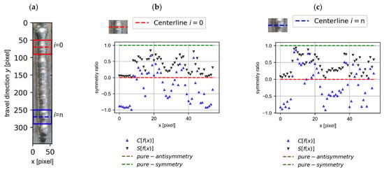 For the calculation of the symmetry in the advance, longitudinal direction, a moving window was used in the calculation of symmetry. The way to proceed is starting from the image of the bead in the xy plane (Figure 9a); the beginnings (Figure 9b) and ends (Figure 9c) of the deposition are discarded to avoid abnormality at the start and end of the weld bead [38], which could be compensated for with various strategies already studied [39,40]. Once the start of the signal has been excluded, a moving window of 40 pixels is defined in the y direction. With the central line in the middle axis of the window, the symmetry for that axis is calculated, as shown in Figure 9b,c.