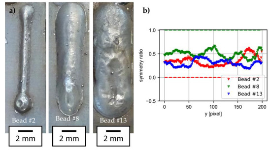 This subsection analyzes the possible application of the methodology developed in this article in another case of additive manufacturing by WAAM. Figure 12a shows the longitudinal image of the beads for a case of WAAM in ER70 extracted from the literature [15]. For these images, we applied the formula proposed in Section 3.1. It is visually observed how in test 13 the bead presents an irregular outer surface despite being a fairly homogeneous bead in width. Once the initial and final sections of the chord were removed, the symmetry ratio along the forward direction y was obtained (Figure 12b).