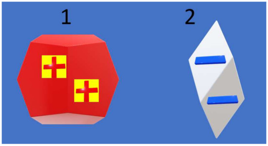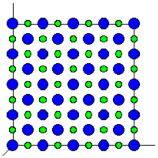In the previous section, we showed that intrinsic parameter limitations, especially dielectric breakdown, lead to a somewhat modest amount of momenta that can be gained by a relativistic motor. However, it seams that in the microscopic domain, this limitation is rather relaxed. For example, consider ionic crystals such as the prevalent table salt: . This salt solidifies to a face-centered cubic lattice in which the lattice constant is pm. Taking, for example, the 100 plane of this lattice (see Figure 6), we can see that the charge density is periodical in which in each half unit cell, we have a surface charge density of . This is, of course, a thousand times larger than the available macroscopic charge densities (see Section 3.4); however, on the macroscopic average, this leads to a null charge density.