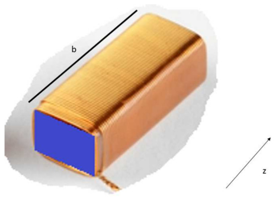 It can be seen that for , the function is null, while for it approaches . Hence, if the ratio of the size of the engine to the winding width is about 20 and , one does not lose a significant amount of force and momentum due to the return current. However, looking at the case depicted in Figure 5, we see an obvious advantage for a slender relativistic motor in the direction of motion.