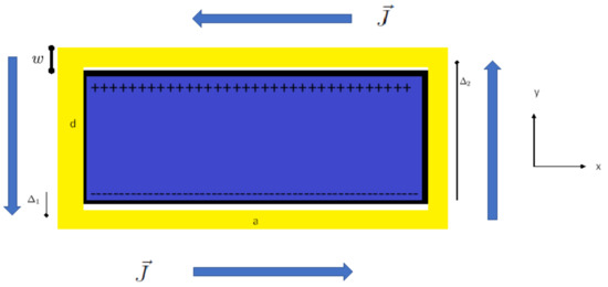 As the current in the x direction is close to the negative charge, it makes a considerable contribution to the momentum equation Equation (87), while the return current, which is far away from the negative charge, makes a relatively small contribution. The situation is reversed with regard to the positive charge; here, the return current makes the main contribution. Hence, the total momentum contribution is doubled with respect to the current flowing in the x direction and interacting with negative charge alone. The current flowing in the y direction does not contribute to the momentum, as the contribution from the current flowing upwards is exactly balanced by the contribution of the current flowing downwards. Let us look at the negative charge layer in Figure 3. We shall model this as a surface charged layer in the plane with a surface charge density such that