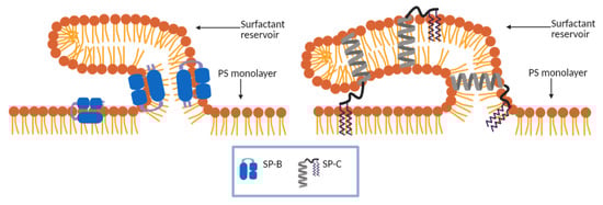 SP-B and SP-C, both of which begin as proproteins, are both hydrophobic in nature [54]. SP-B is modified into a smaller 79-amino acid lipid-associated peptide via proteolytic cleavage of the proprotein, while SP-C is cleaved into its mature form of 35 amino acids [8,55,56]. Both proteins play a significant role in the biophysical function of PS.