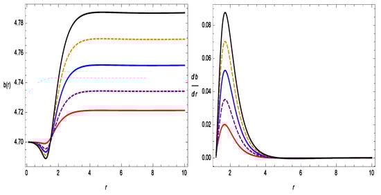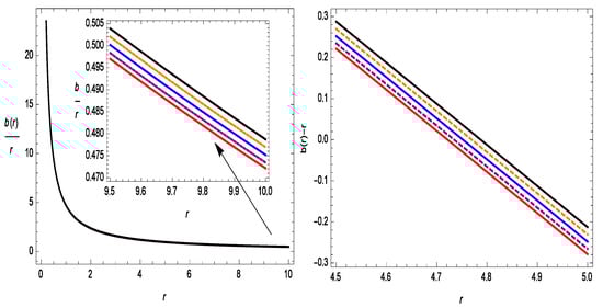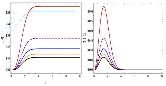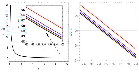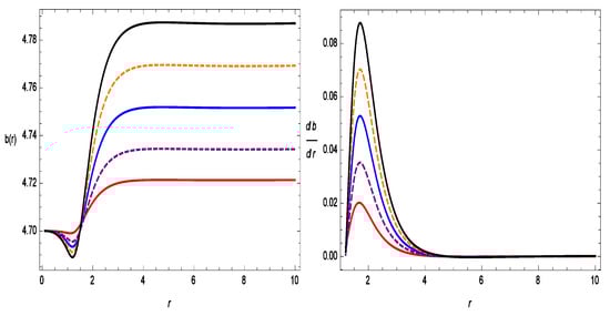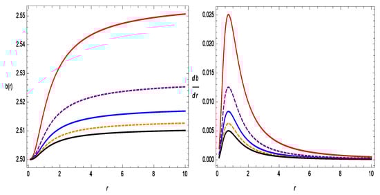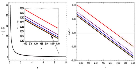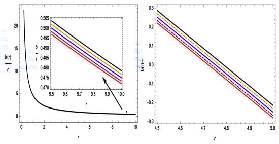 Figure 1 represents the increasing behavior of the shape function with respect to r. The shape function also follows the flare-out condition, i.e., for , the condition is satisfied. In Figure 2, we show the asymptotic flatness condition, i.e., as is satisfied. In the same figure, we also show with respect to r, where one can see the wormhole throat radii for different values of . The WH throats are , , , , and for , , , , and , respectively. Therefore, all of the results for the shape function are suitable for the construction of a WH in gravity.