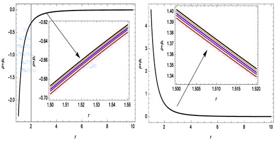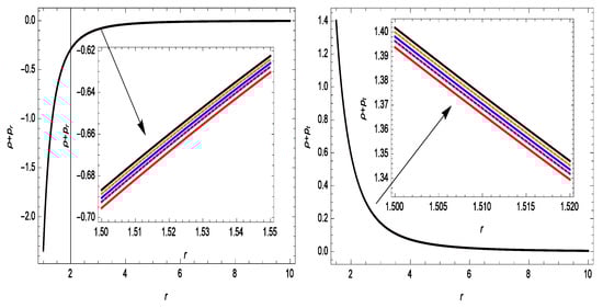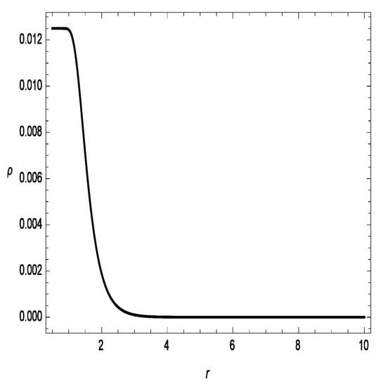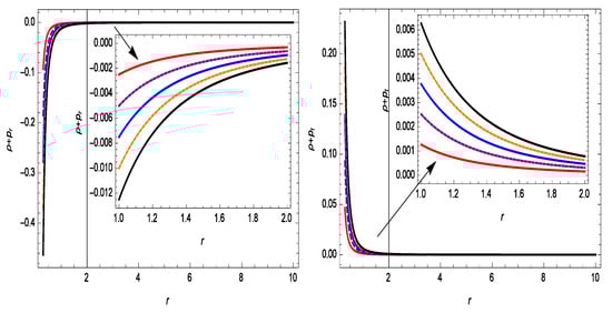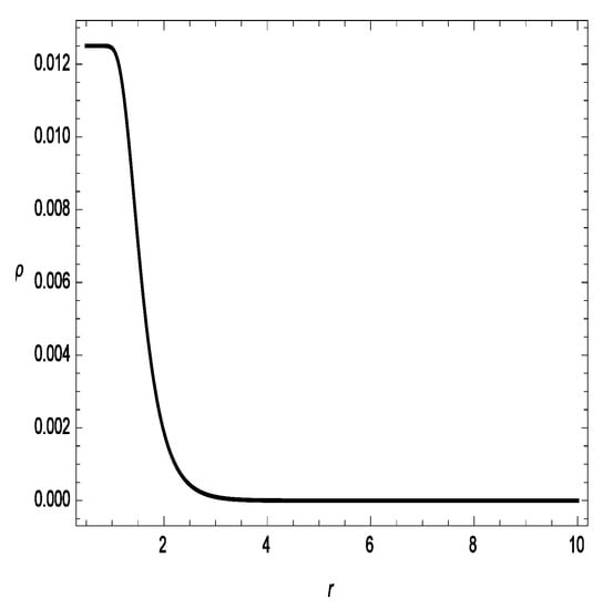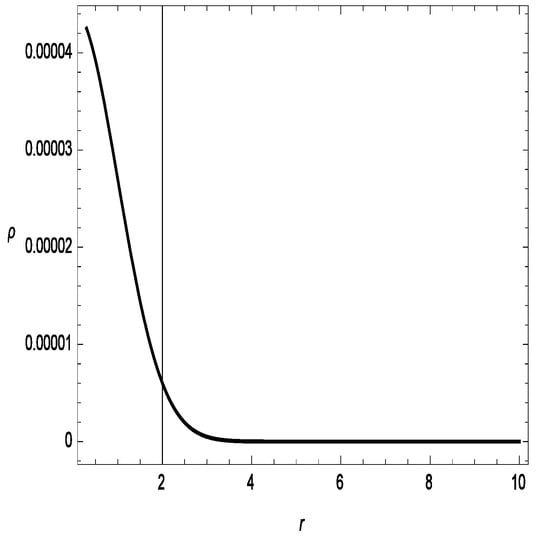 The energy conditions are suitable geometric equipment for checking the cosmological models’ stability. Hence, this tool was chosen to study the considered models. In addition, the linear Lagrangian form of was assumed. Therefore, our cosmological model retains all of the energy conditions of GR. We depict all of the energy conditions for the Gaussian sources in Figure 3, Figure 4 and Figure 5. In Figure 3, we present the energy density versus r, which exhibits a clearly decreasing behavior. One can see in Figure 4 that and , i.e., these are violations of the null energy condition (NEC) for different values of . This gives a piece of evidence for the existence of exotic matter at the wormhole’s throat, which is essential for a traversable WH. In addition, we depict the profile of the DEC in Figure 5. It can be seen from Equation (36) that strong energy conditions yield . This is comparable the outcome presented in [34].