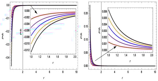To investigate the behavior of the energy conditions for the symmetric teleparallel case in the noncommutative background, we use shape function (27) in Equations (22)–(24). Here, we get the following expressions for the energy density, pressure components, and energy conditions under the Gaussian distribution: