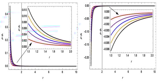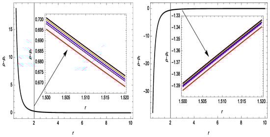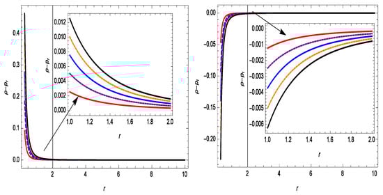By using Equation (37) in Equations (22)–(24), we get the following expressions for the energy density, pressure components, and energy conditions under the Lorentzian distribution: