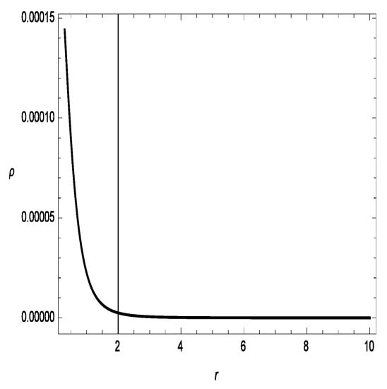 We show the graphical behavior of the energy conditions under the Lorentzian source in Figure 8, Figure 9 and Figure 10. In Figure 8, we present the energy density versus r, which exhibits a clearly decreasing behavior throughout the spacetime. From Figure 9, we can observe that the NEC is violated because . Subsequently, it can be determined that the wormhole solutions that have been procured are acceptable in this gravity. In addition, we present a graph of the DEC in Figure 10. From Equation (45), we can see that the strong energy condition (SEC) yields . This is comparable to the outcome presented in [34].