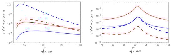 The Z boson exchange obviously dominates at the Z pole, and also essentially contributes to the production cross section around this pole is such a way that the its contribution to the total cross section value is greater than 20% for energies for the -pair production process and for energies in the range for the -pair production process (see Figure 5).