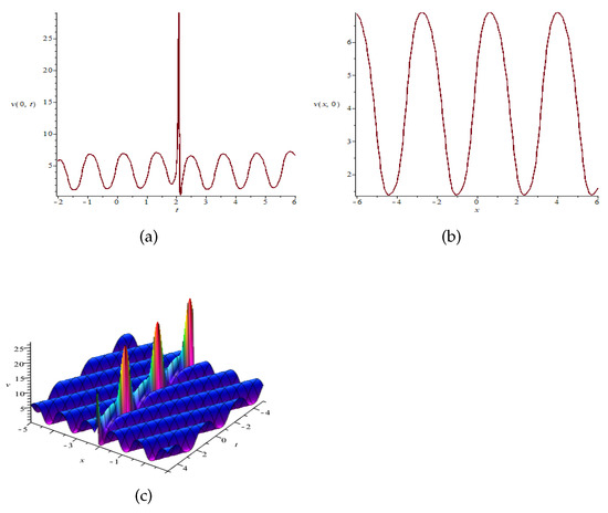 Similar to Table 1, the numerical analysis of v at also be derived. By taking the value of time t at some key points, the numerical analysis is almost completely consistent with the two-dimensional graph Figure 2a of the exact solution. From Table 2, we can see that the value of v reaches the maximum at , which is close to 29.07. That is the result of the interaction between the soliton and the elliptical periodic wave. The collision is an elastic collision. Since, when to 1.2234 and to 5.7031, the values of v present a periodic characteristic, the maximum value is 6.70, and the minimum value is 1.36.