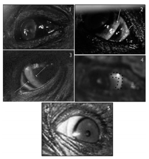 Illustration of qualitative patterns and quantitative degree of depigmentation by Mayhew and Gómez (2015) [5]. Image 1 would be ranked as 0 in degree of depigmentation, while image 5 would be ranked as 10, or human-like. The five images illustrate the qualitative patterns. 1: All dark sclera; 2: Patchy pattern; 3: Banded patterns; 4: Crescent pattern; 5: All white pattern. Reprint with permission © 2015 John Wiley & Sons, Inc. (Hoboken, NJ, USA).
