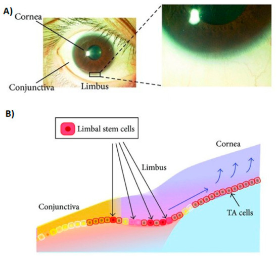 (A) The limbus is the point where the conjunctiva and cornea meet. (B) Epithelial stem cells from the limbus differentiate and migrate to the cornea constantly so that it remains transparent. Both figures taken from [22] under CC BY 3.0 license.