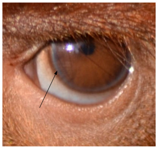 We frequently observed dark rings that were bilaterally symmetric. Sometimes, these rings seemed to be caused by pigment, as in Figure 2. In humans with lighter irises, this area where the cornea and conjunctiva meet is called the limbus, and it may appear darker than the surrounding iris or conjunctiva (Figure 4 below). While some of the darkness can be attributed to structural coloration of the ocular tissues in humans [11], pigments may also contribute to its appearance [12]. The clinical literature has looked at the importance of the limbus as a repository of epithelial stem cells that continuously renew the cornea to keep its transparency, presumably by migrating from the palisades of Vogt, where they are protected from external pathogens and lesions. Keeping the transparency of the cornea is vital for normal vision, and the greater proliferative potential of stem cells can result in an accumulation of transcription errors during meiosis [13]. Protecting the stem cells in the limbus from ultraviolet light [14] or infections [15] seems thus likely functions of limbal rings in humans. It should be noted, however, that protective functions of the limbal ring have not been proposed in the clinical literature.