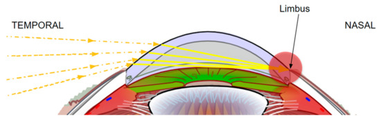 Incident light from the temporal side enters the cornea unobstructed and is focused by the cornea to the nasal side, where small spots of the cornea can reach up to twenty times the amount of UV-B radiation compared to equivalent spots on the temporal side. Image modified for clarity, added light details and labels. Based on an original illustration by Jmarchn, used under CC BY-SA 3.0 license.
