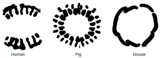 Another aspect of human eye anatomy that reinforces the idea that scleral pigmentation protects the eyeball from harmful UV-B radiation is the near absence of stem cells in the lateral eyeball. By contrast, the vertical eye axis concentrates the great majority of stem cells [45]. Research comparing stem cell distribution in pigs, mice, and humans shows that the orientation of the eyeball relative to the face, the presence or absence of brow ridge, and patterns of activity all influence stem cell distribution [45]. For example, pig eyes are more laterally oriented and are not shielded by brow ridges, resulting in less variation in light and UV-B incidence over the circumference of the eye. As such, pig eyes display stem cells all around the cornea. Mice, which are active at night, have a more even distribution of stem cells [45]. In humans, stem cells are concentrated on the anterior and posterior limbus, protected by the upper and lower eyelids, respectively. Humans, thus, can do without scleral pigmentation to protect these cells. A comparison of the distribution of epithelial stem cells in the limbus of humans, pigs, and mice is represented in Figure 8. We are not aware of any account of the distribution of epithelial stem cells in the limbus of nonhuman primates. Examining the co-distribution of epithelial stem cells in primates and areas of pigmented sclerae could provide additional support for the function of pigmented sclerae in stem cell protection.