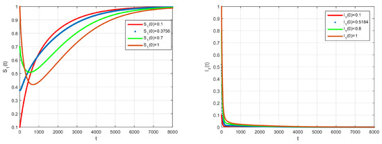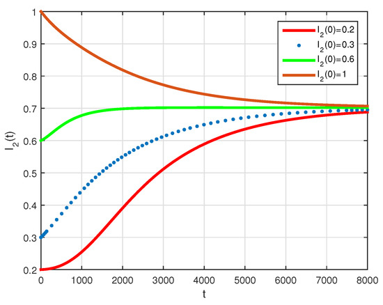 Suppose that system (2) has the parameters β 1 = 0.003 ,   β 2 = 0.00048 , μ 1 = 0.0002999 , μ 2 = 0.001609 ,   α 1 = 0.001 ,   λ 1 = 0.0265 , p = 0.5 .
