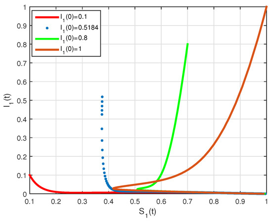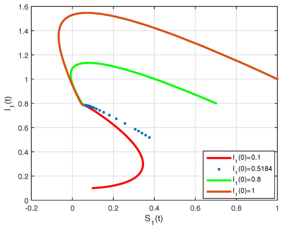 Figure 9. State diagrams of S 1 vs. I 1 for system (2), using β 1 = 0.006 ,   β 2 = 0.00048 , μ 1 = 0.0002999 , μ 2 = 0.001609 ,   α 1 = 0.001 ,   λ 1 = 0.000265 ,   p = 0.1 ,   ( R 0 = 67.5446 > 1 ) .