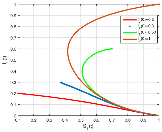 Figure 4. State diagrams of S 1 vs. I 2 for system (2), using β 1 = 0.003 ,   β 2 = 0.00048 , μ 1 = 0.0002999 , μ 2 = 0.001609 ,   α 1 = 0.001 ,   λ 1 = 0.0265 ,   p = 0.5 ,   ( R 0 = 0.0675 < 1 ) .