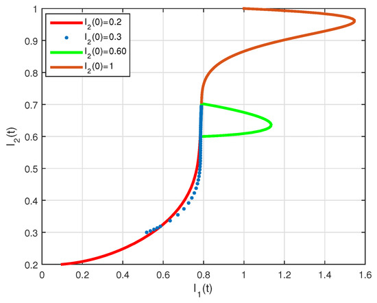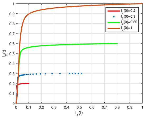 Figure 11. State diagrams of I 1 vs. I 2 for system (2), using β 1 = 0.006 ,   β 2 = 0.00048 , μ 1 = 0.0002999 , μ 2 = 0.001609 ,   α 1 = 0.001 ,   λ 1 = 0.000265 ,   p = 0.1 ,   ( R 0 = 67.5446 > 1 ) .