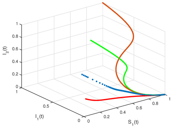 The basic reproduction number is such that R 0 = 67.5446 > 1 and the system (2) has the endemic equilibrium of E * = ( S 1 * , I 1 * , I 2 * ) . The numerical simulation of system (2) with initial conditions is illustrated in Figure 7 and Figure 8, all these solutions converge to the E * ( 0 , 0498 , 0.7893 , 0.70 ) . The phase diagram of ( S 1 , I 1 ) with different initial conditions is given in Figure 9. Figure 10, Figure 11 and Figure 12, show the phase diagram of ( S 1 , I 2 ) , ( I 1 , I 2 ) and ( S 1 , I 1 , I 2 ) , with three initial conditions. The figures confirm the endemic equilibrium E * is globally asymptotically stable and all solutions converge to the endemic equilibrium point under the mentioned initial conditions.