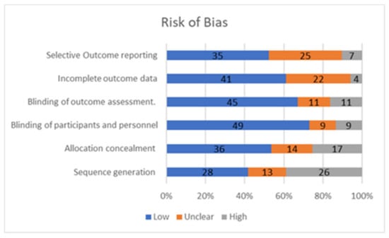 The risk of bias was evaluated using a subjective judgment (high, low, or unclear) regarding the individual elements of the domains represented in Figure 1. Once the classification was made, a percentage estimate of these judgments was obtained. On average, the different domains were approximately 58% low, 23% unclear, and 18% high risk of bias.