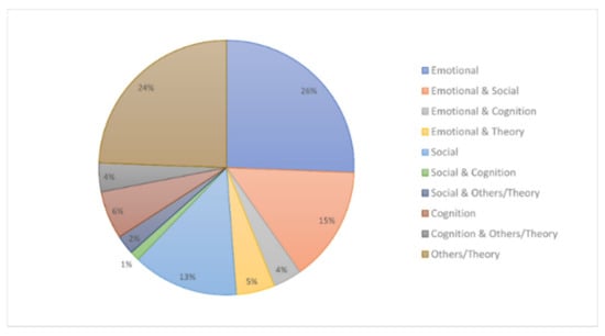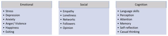 This literature review proposes three main categories to classify human behavior in the context of text mining: cognitive, emotional, and social behaviors. Most of the literature conveys how textual data are analyzed to understand the activities, mental skills, and social interactions among people, with the goal of identifying emotional, social, and cognitive behaviors, whose characteristics are depicted in Figure 6 [55].