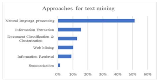 Figure 4 represents the percentages for each of the analyzed text mining approaches. The results indicated that more than 50% of the reviewed literature was completed by using natural language processing (NLP), which was one of the strongest approaches. This method was followed by information extraction (15%); document classification and clusterization (13%); and web mining, information retrieval, and summarization (20% combined).