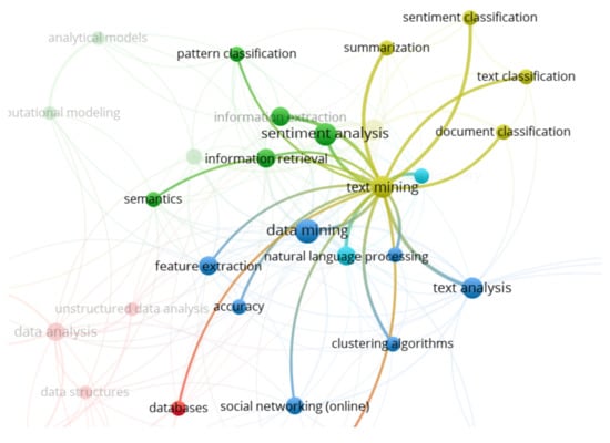 We also provide a map of the co-occurrence of the “text mining” term in the title and abstract in Figure 5. We used VOSviewer software (https://www.vosviewer.com/, accessed on 10 June 2021) to map the bibliometric data as a network and develop keyword co-occurrence maps.