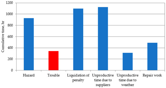 The main causes of unproductive drilling time at one specific field are shown in Figure 3. The greatest losses of time were due to rig downtime in waiting for contractors and equipment. Then, there is unproductive time due to the liquidation of penalties (unscheduled work, redrilling due to the fault of the contractor, etc.). In this project, we are interested in the trouble (DPs) that arises during the drilling process. This includes kicks, loss of circulation, and borehole instability.