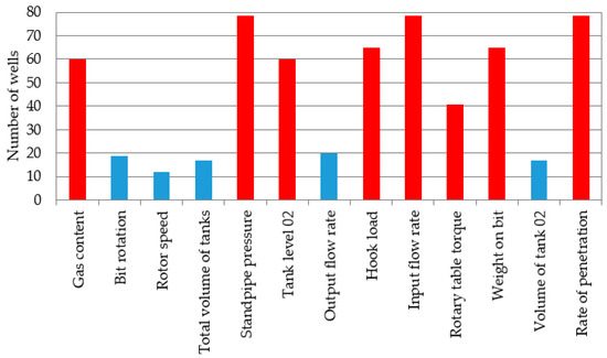 For further analysis, all drilling parameters that were recorded for each well were considered. The analysis of the data showed that not all the wells from the sample have the same number of corresponding recorded drilling parameters. Some wells recorded the minimum number of parameters. We would like to note that drilling reports were provided for 67 wells, but the files with the recorded drilling parameters were provided for 78 wells. Therefore, data representing 78 wells were analyzed. For a wide analysis of the drilling parameters recorded on the wells, reports from 78 wells were taken into account. It can be seen from Figure 4 that only eight parameters are the most commonly reported for all wells; these are highlighted in red. Additionally, these parameters will be used as input parameters for the classification of complications.