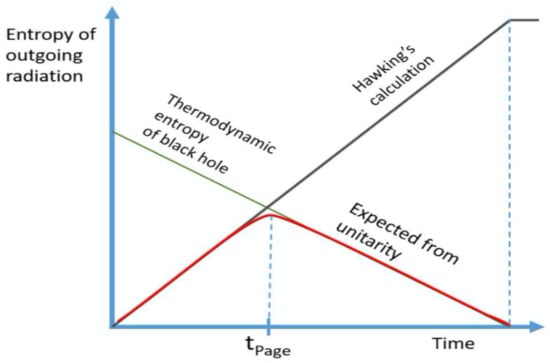 Schematic diagram showing the entropy of the outgoing radiation of the evaporating black hole as a function of physical evolutionary time scale. This schematic diagram was taken from [65].