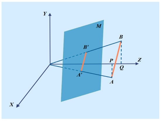 where  is the 3D coordinates of point .  is the difference on depth coordinate of  and . In the whole projected plane,  and  are width and height coordinates for point . The difference of depth information  between points  and  is calculated using Equation (1) because , , , , , , and  are known. Thus, the 3D coordinates of point  are obtained.