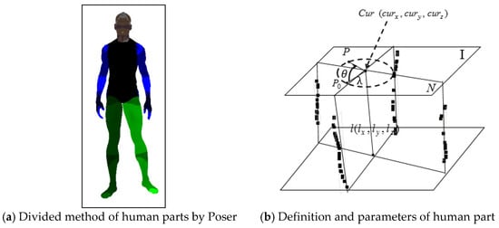 In order to describe the human parts more clearly, some critical definitions of human parts are described in Figure 6b: (1) direction  of various parts. It determines the variation trend of the skeleton segment corresponding to the current human part, and it is also the common centerline of the sections in different directions. (2) vector  of human part. 3D coordinates are represented for the direction of the part, which is mainly used in the location of the target point and the calculation of normal vector of the direction section. (3) Direction angle . If the normal vector of the section is parallel to the Z-axis,  equals to 0. That is, the angle between the normal vector of the current section and the Z-axis is the direction angle  of the section. (4) Target point . It is mainly used to locate the direction angle and obtain the normal vector of the direction section, and it is obtained by the center point Cur of section I paralleling to the ZOX plane, and specific distance . (5) Direction section . It mainly obtains the direction section by intersecting with the current human part. The normal vector of the cross section is obtained by the corresponding direction angle. (6) Direction curve. It is mainly generated by the intersection of the section in different directions and the current human part. That is, shape features of different directions are represented based on corresponding direction curves. The data points of different directions are shown in Figure 6b.