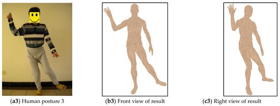 Then, we tested the stability of the SOFNN in [] and the DRFNN with several limb parts of different postures. In our experiment, different human sequence postures are selected by captured human motion images. Figure 7a1–a3 show the selected original human motion postures, Figure 7b1–b3,c1–c3 are the front and side views of evaluation results of corresponding postures, respectively. As shown in the figure, evaluated results of selected three postures are satisfactory based on the proposed DRFNN model. Furthermore, Table 3 shows the comparison result of the proposed DRFNN and SOFNN models on eight limb parts when the selected three postures are considered. Pos1, Pos2, and Pos3 are the three poses in Figure 7a1–a3. – are joint angles of corresponding limb parts (Figure 1). The target examples are the observed joint angles of limb parts on the three poses in Figure 7a1–a3. The error of – is the average value of difference between the evaluation results and the observed results based on the selected three poses when SOFNN and the proposed DRFNN models are applied. The obtained errors of the selected three postures by using the DRFNN are slightly less than the corresponding result obtained by the SOFNN in []. It is an important improvement since the accuracy of limb parts on symmetric target human body is critical for motion analysis on different human postures.