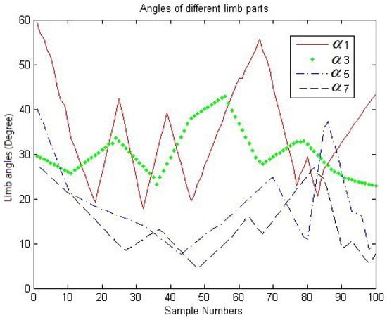 Figure 8 shows the obtained angles of four limb parts for human sequence postures which includes left upper arm, right upper arm, left thigh, and right thigh. The unit of obtained angles is degree. Furthermore, the angles of left and right upper arm for sequence postures are obviously greater than that of left and right thigh. In addition, the changes in angle of thigh are relatively smaller than the corresponding result of upper arm for human postures. The phenomenon can be attributed to the greater activity range from upper arms when the human body locates on different postures, such as walking and running.