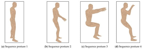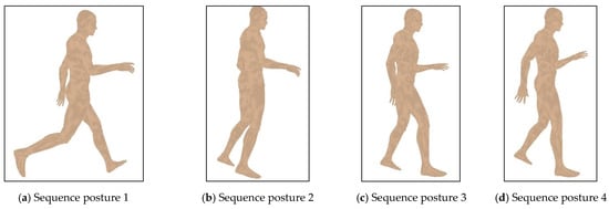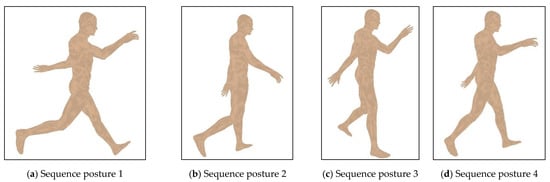 Additionally, a set of experiments concerning the applicability of the proposed DRFNN is presented. The proposed algorithm is applied for predicting the sequence motion gestures of human models for three different postures. The models used in the experiments are all provided by free 3D human models database []. Figure 12, Figure 13 and Figure 14 show the evaluation results of human motion sequence corresponding to the posture of walking, running, and sitting, respectively. All of the postures on models shown in Figure 12a–d, Figure 13a–d and Figure 14a–d correspond to the best evaluated results of intervening sequence motion gestures. As shown in the figures, almost all of the evaluated results of sequence gestures are accurate for all of three different postures. Furthermore, the positions and angles of different human limb parts are reasonable when different human postures are considered. All of the evaluated sequence gestures can represent the complete human motion. That is, the evaluation results of different postures are satisfactory when the proposed DRFNN is applied. Therefore, the proposed DRFNN improves evaluation result of various inputs and overcomes the interference arising from different human limbs.