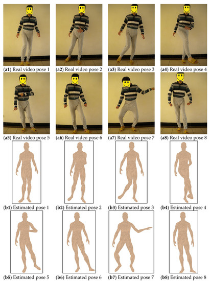 In order to evaluate the performance of DRFNN model in processing arbitrary human postures, motion sequence video of different human postures is captured for recognizing human postures. Figure 15 shows the evaluation results of real human motion sequences of various postures. Figure 15a1–a8 are the captured pose frames of real human motion video, and Figure 15b1–b8 are the corresponding estimated poses using virtual 3D human model based on the proposed DRFNN model. As shown in the figure, almost all of the estimated results of various human poses are accurate, except for slight deviation of right arm and right leg in pose 3, left leg in pose 6. This phenomenon can be attributed to the adjustment of human joint points on the Z axis, which leads to the slight deviation of 3D coordinates of joint points estimated by our method. However, as a whole, the estimation results of various human postures are satisfactory based on the proposed DRFNN model.