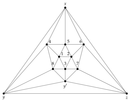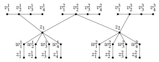 Let . Without loss of generality, we may assume that and . Hence the function f restricted to is a [4]-RDF of , implying that . As a result, by the induction hypothesis, , and this completes the proof. □