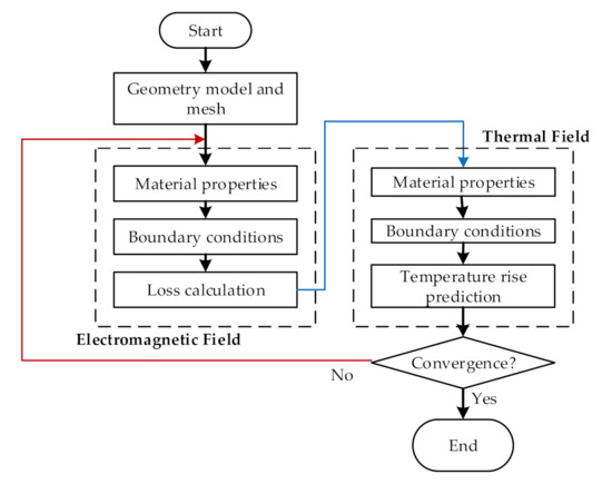 The loss inside each point of a dry-type transformer is different, resulting in different heat source properties. The heat loss calculation will affect the results of field temperature analyses. In order to accurately calculate temperature fields and determine hotspot locations, this paper establishes an electromagnetic thermally coupled model to analyze the internal temperature distribution of a dry-type transformer. First, a 3D finite element electromagnetic field model is established with corresponding material properties for different components. An external circuit is used to realize the coupled field–circuit calculation to obtain each part of the loss. The core and winding losses obtained by the analysis are coupled to the temperature field analysis with a heat source input for temperature analysis. The corresponding heat dissipation coefficient for convection is set to obtain the temperature distribution for each region of interest. The rates of temperature change are far smaller than the rates of change for the electromagnetic field. The temperature of the transformer is calculated by indirect coupling. The coupling method is shown in Figure 2 and the coupling steps are given as follows: