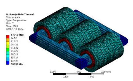 - An indirect coupling method is used to couple the electromagnetic and temperature fields, in which the loss is used as the transmission medium to realize coupling and the distribution of the temperature field of each part is analyzed;