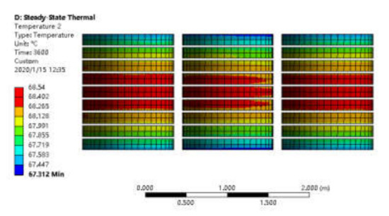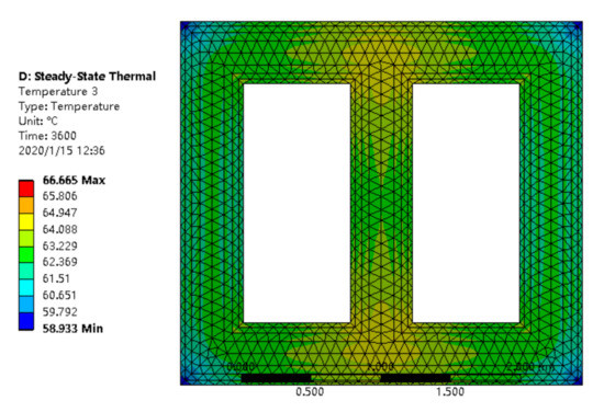 By using the ANSYS Workbench simulation platform, the core and winding losses obtained by a Maxwell electromagnetic field simulation were coupled in a steady-state thermal field simulation software package to determine the temperature field distribution. Combined with the ambient temperature information recorded by the offshore platform, the ambient temperature was set to 22 °C and the temperature distributions under different working conditions were simulated as shown in Figure 5, Figure 6, Figure 7 and Figure 8 for the temperature distributions inside the transformer under various rated working conditions. It can be seen from the distribution diagram that a hotspot temperature location appeared in the low-voltage winding. This is because the dry-type transformer mainly dissipates heat by natural air convection, and the internal heat dissipation methods are mainly heat conduction, convection, and radiation. Specifically, the core and winding are internal heat sources and the heat is transferred to a solid surface through the iron core and the winding by heat conduction. Air channels for heat dissipation exist between the windings in general and additionally between the low-voltage winding and the core. Due to the high current flowing through the low-voltage winding, the low-voltage winding generates more heat than the core and the high-voltage winding. Meanwhile, the heat dissipation effect is not optimal, so the temperature of the low-voltage winding is higher than the other two parts.