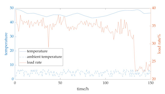 The temperature sensor monitored the transformer temperature continuously and data were recorded every hour. The measured data obtained from a 35 kV dry-type transformer for use in an offshore oil and gas platform power system were used as the sample data for prediction. The transformer parameters are shown in Table 1. Figure 13 demonstrates data for the factor under consideration, including the historical hotspot temperature, ambient temperature, and load rate. Furthermore, the figure hints at the times at which the hotspot temperature exceeded 80 °C, fan turned on, and state changed from 0 to 1.