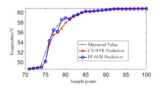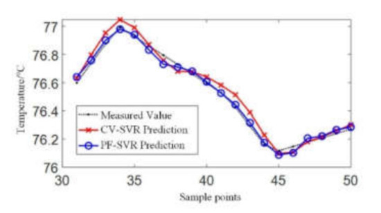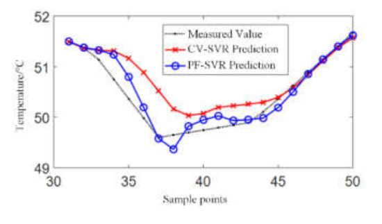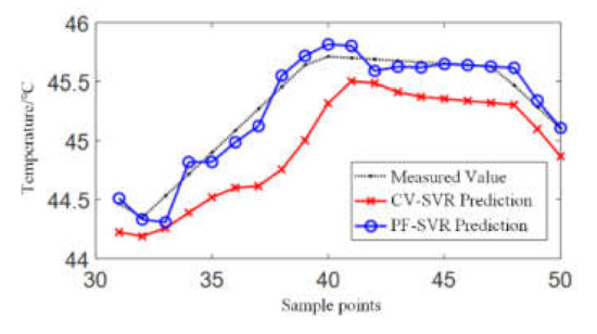 In order to show the superiority of the PF-SVR prediction method, a traditional support vector regression algorithm was compared here. Fifty sets of data from January 2019 were selected. The input data included the ambient temperature, load rate, fan status, and historical hotspot temperature, and the output included the predicted temperature. The first 30 sets were used for training and the remaining 20 sets were used for testing.