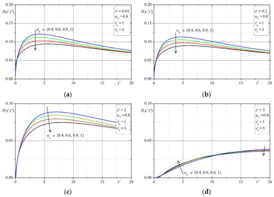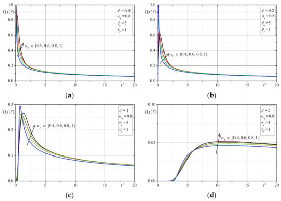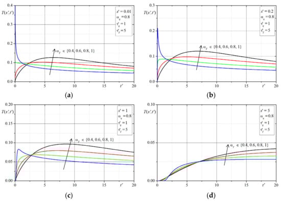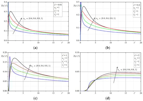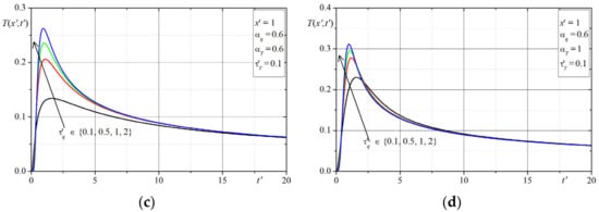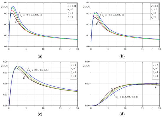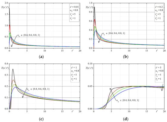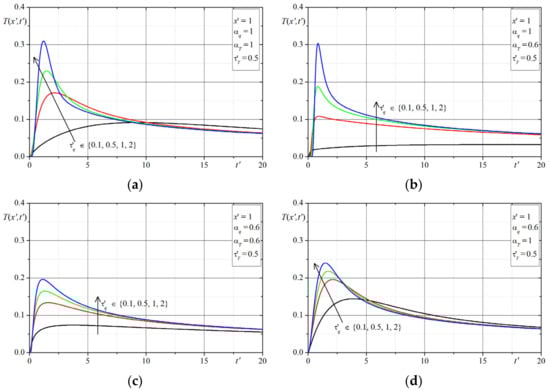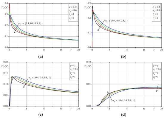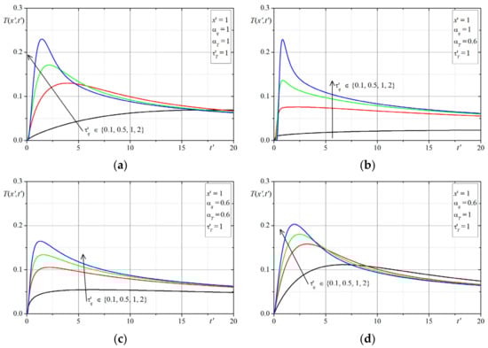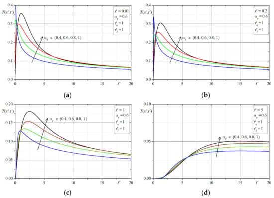 The first example concerns the effect of the time-fractional order of the both Caputo derivatives on the temperature distribution. The time-history’s temperatures in selected points are presented in Figure 1, Figure 2, Figure 3, Figure 4, Figure 5, Figure 6, Figure 7 and Figure 8. The graphs in each figure are done for fixed values of lags parameters , and for: fixed values of order and various values of order (Figure 1, Figure 2, Figure 3 and Figure 4) or fixed values of order and various values of order (Figure 5, Figure 6, Figure 7 and Figure 8).